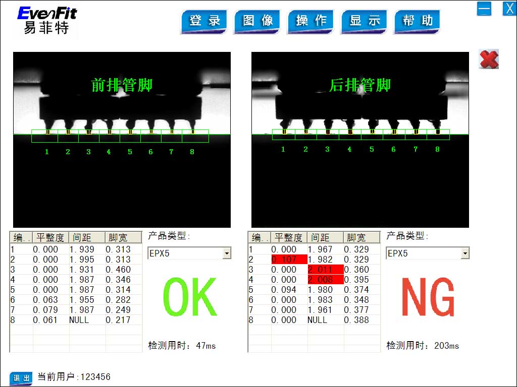 任一管脚超出公差设定的范围,软件会自动显示不良位置,同时发出报警信号